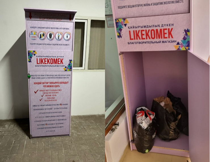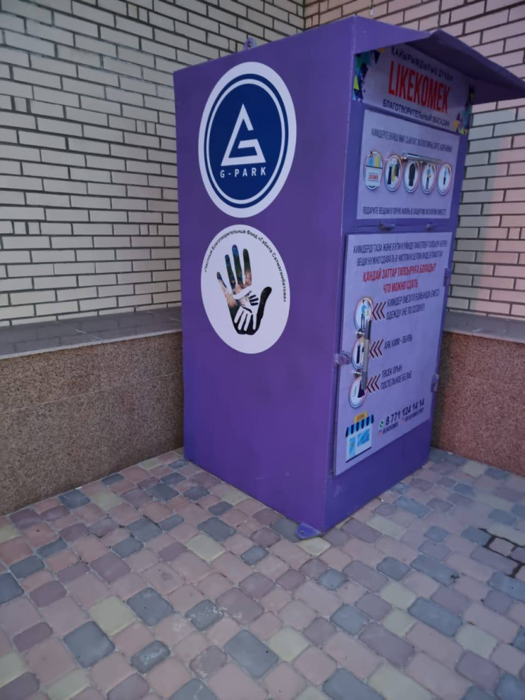 Боксы установили Даулет и Асемгуль Керейбаевы - основатели сети благотворительных магазинов LikeKomek. Уличные металлические боксы окрашены в фиолетовый цвет. Внутри помещений стоят боксы из ЛДСП розового цвета.