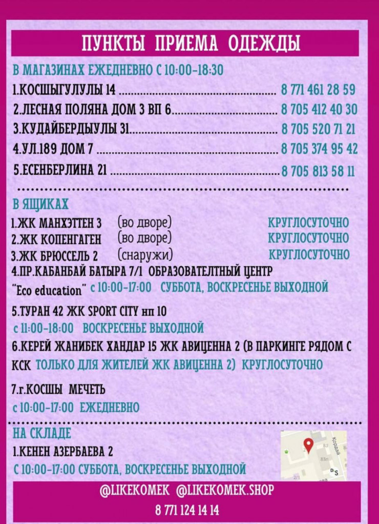 - проспект Кабанбай батыра, 7/1, ящик в образовательном центре Eco education, 10:00-17:00, суббота, воскресенье - выходные;