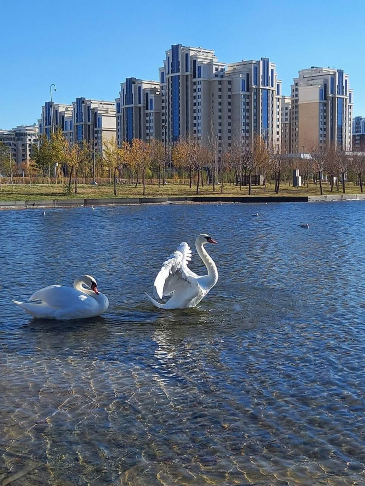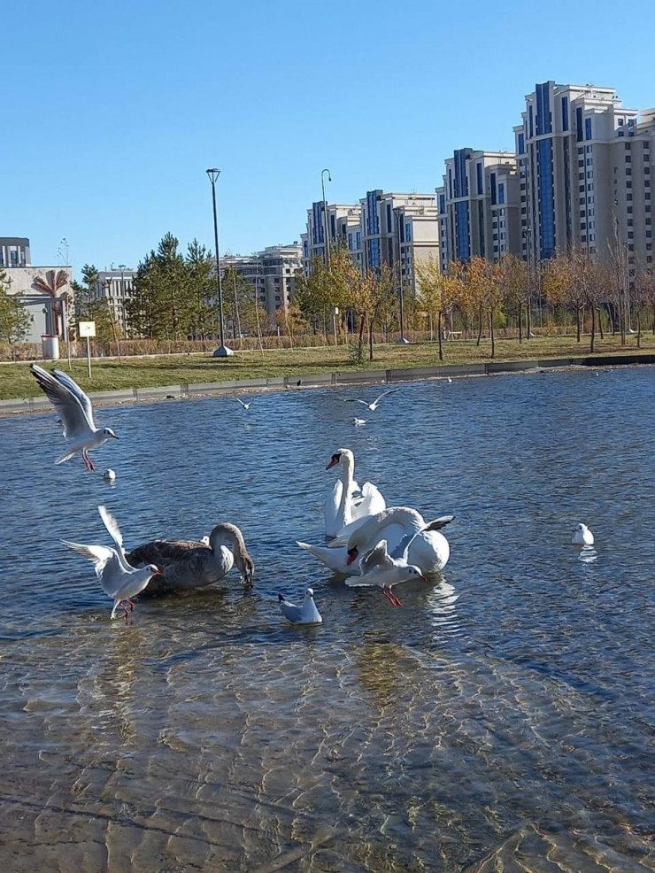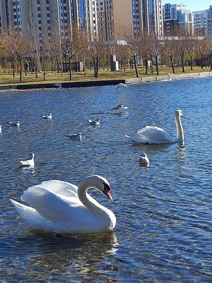 В Астану прилетели лебеди, передает корреспондент Tengrinews.kz. Как сообщают горожане, они обосновались в Ботаническом саду столицы.
