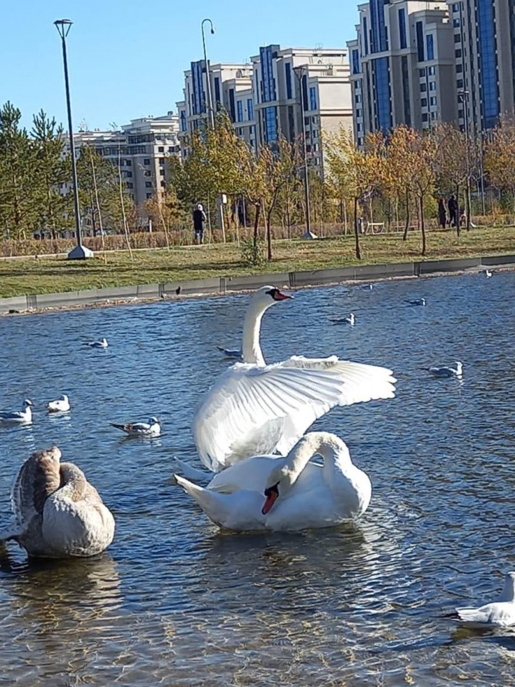 В Астану прилетели лебеди, передает корреспондент Tengrinews.kz. Как сообщают горожане, они обосновались в Ботаническом саду столицы.