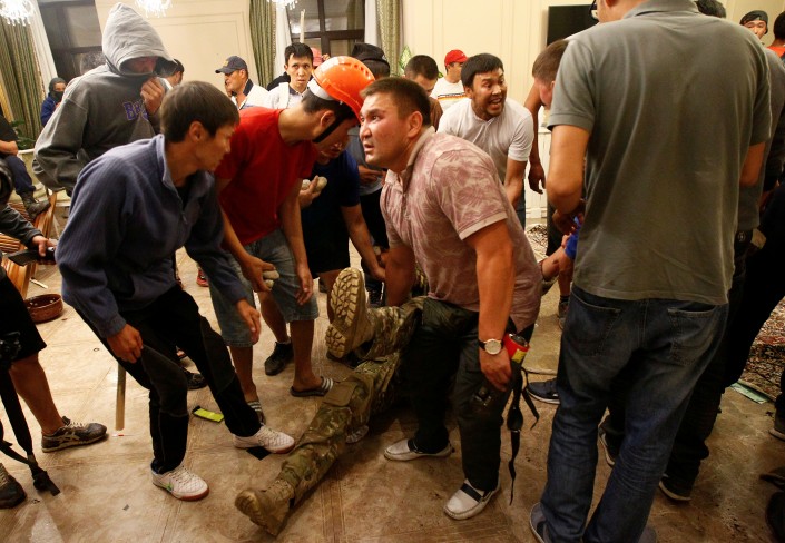 Сторонники Атамбаева и боец спецназа. REUTERS/Vladimir Pirogov
