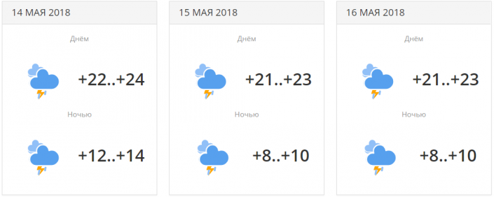 Город все три дня ожидают дожди с грозами и днем и ночью. Температуры будут находиться в районе +21...+24 градусов днем и +8...+14 градусов ночью.