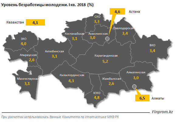 Самый высокий уровень безработицы среди молодежи за первые три месяца 2018 года зафиксирован в Алматы - 6,5 процента. Далее Карагандинская область - 5,2 процента и ЮКО - 4,8 процента.