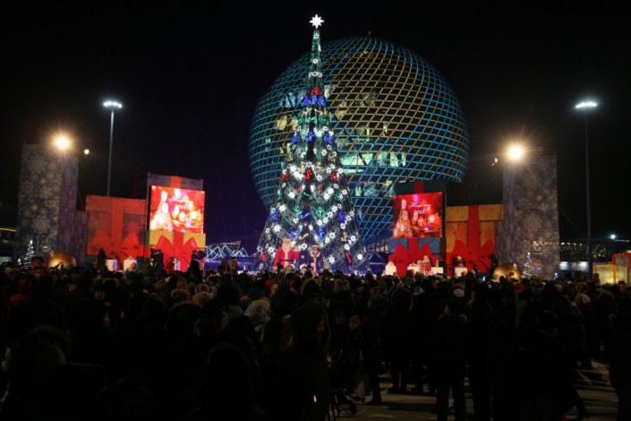 Главную елку страны торжественно зажгли 18 декабря на территории выставочного комплекса EXPO-2017. Новогодняя красавица установлена у подножия павильона "Нур Алем". Гостей вечера развлекали Дед Мороз и Снегурочка.
