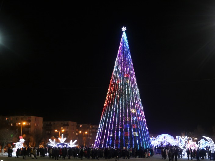 В Актау установили первую 12-метровую новогоднюю елку на площади Ынтымак, вторую - на площади Астана. Акиматом города в 2015 году были приобретены две искусственные ели на 11,2 миллиона тенге. В этом году заменили только гирлянды и поврежденные украшения. Из местного бюджета на оформление города к Новому году выделили 13,9 миллиона тенге.