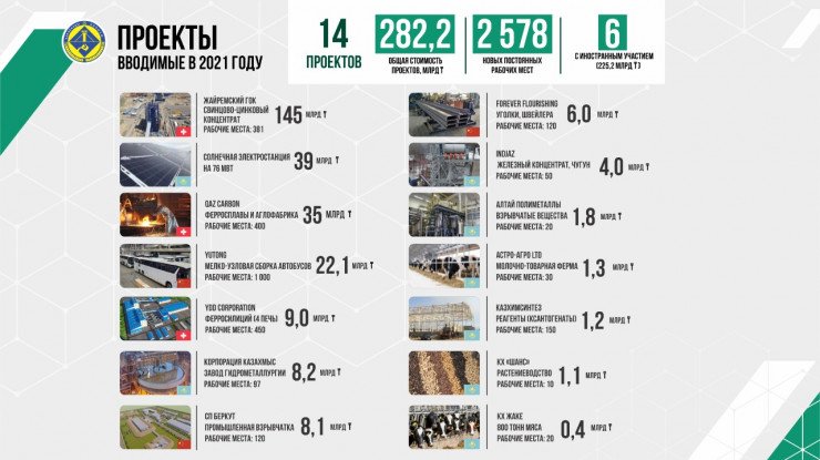 "Мы ставим перед собой задачу привлекать как можно больше инвестиций и создавать новые рабочие места. В 2020 году привлечено 678,3 миллиарда тенге, из которых доля частных средств - 81,6 процента. Более 2 500 новых рабочих мест обеспечил запуск 11 новых инвестиционных проектов, - сказал аким области. - В 2021 году планируем привлечь не менее 715 миллиардов тенге инвестиций, из них свыше 80 процентов - частные. Ожидаем открытия 14 новых производств на 282,2 миллиарда тенге, которые обеспечат работой еще 2 600 человек".