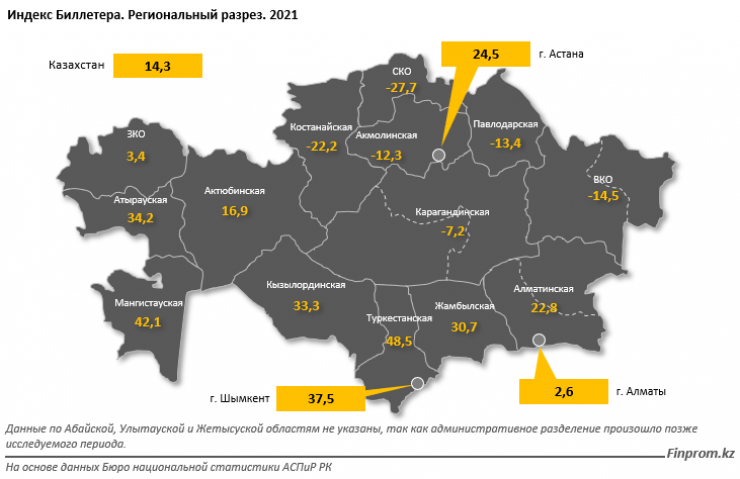 По исследованиям Бюро национальной статистики Агентства по стратегическому планированию и реформам Республики Казахстан, в 2021 году самый высокий отрицательный индекс Биллетера наблюдался в Костанайской и Северо-Казахстанской областях: -22,2 и -27,7 соответственно. Провести свою старость казахстанцы предпочитают в Восточно-Казахстанской, Павлодарской, Карагандинской и Акмолинской областях.