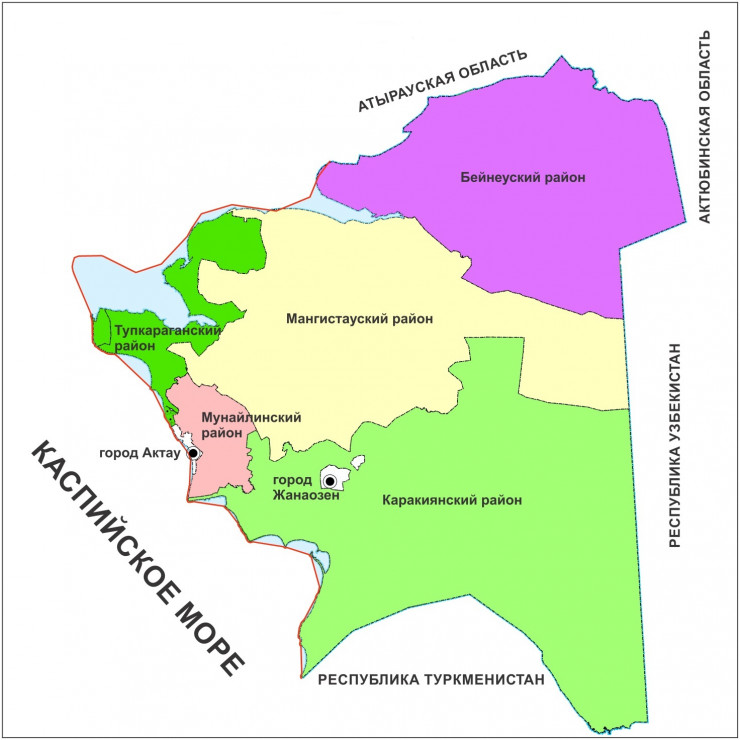 - площадь от границы области до исходной линии отсчета ширины территориальных вод (моря) по Мангистаускому району – 68421,9385 гектара;