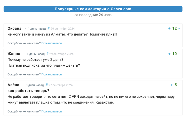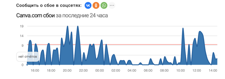 Об этом также свидетельствуют данные с сайта downradar.ru. Судя по данным сайта, Canvа не открывается начиная с выходных. При этом пользователи отмечают, что сервис работает через VPN.