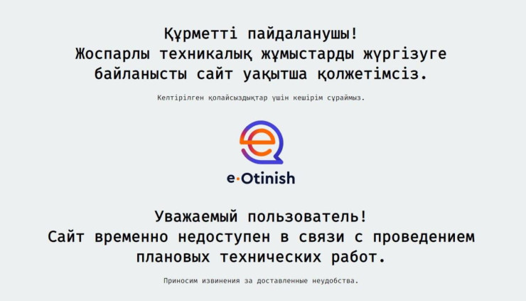 "В настоящее время наблюдается некорректная работоспособность сайта электронных обращений e-Otinish.kz. На данный момент ведутся работы по восстановлению сайта. Ожидается восстановление работоспособности в ближайшее время. Приносим свои извинения за временные неудобства", - говорится в сообщении.