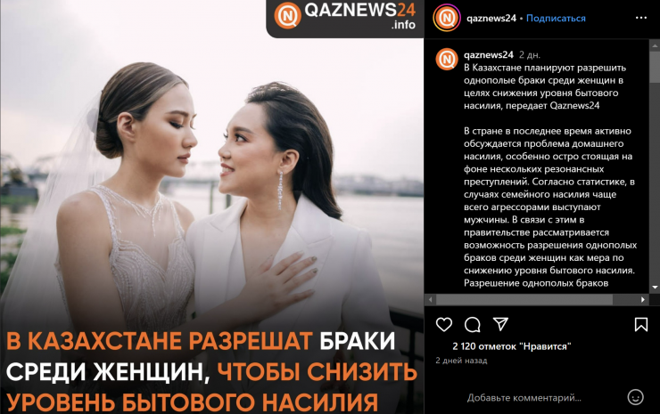 В соцсетях распространяется "новость" о том, что в Казахстане планируют разрешить однополые браки среди женщин, чтобы снизить уровень бытового насилия, передает Tengrinews.kz со ссылкой на Stopfake.kz.