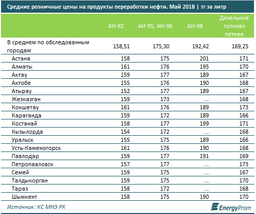 АИ-95/96 также подешевел к апрелю на 1,7 процента, однако вырос в цене за год на 12,9 процента, до 175,3 тенге за литр в мае 2018. Цены на АИ-98 за месяц практически не изменились, за год выросли на 16,6 процента, до 192,4 тенге за литр.