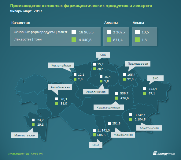 По данным аналитиков, за первый квартал 2017 года производство основных продуктов фармакологической промышленности достигло в стоимостном выражении 19 миллиардов тенге - это сразу в 2,2 раза больше, чем в аналогичном периоде 2016 года.