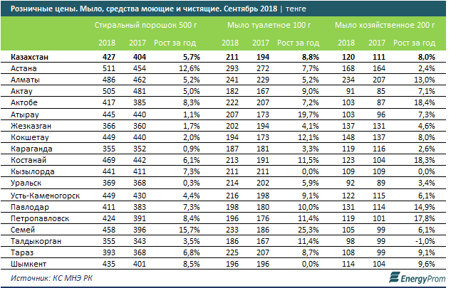 В Казахстане подорожали мыло и стиральный порошок, передает корреспондент Tengrinews.kz со ссылкой Energyprom.kz.