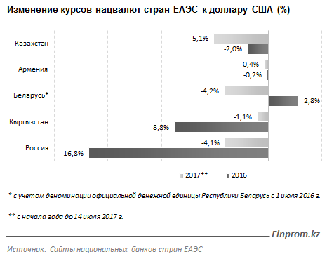В Беларуси национальная валюта по отношению к доллару США в текущем году окрепла на 4,2 процента, в России - на 4,1 процента, в Кыргызстане - на 1,1 процента, в Армении - на 0,4 процента.