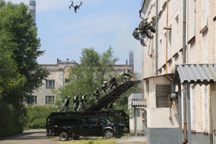 В процессе учения в рамках условно введенного "красного уровня террористической опасности" подразделениями специального назначения проведена специальная операция по освобождению заложников, обезвреживанию и ликвидации террористов.