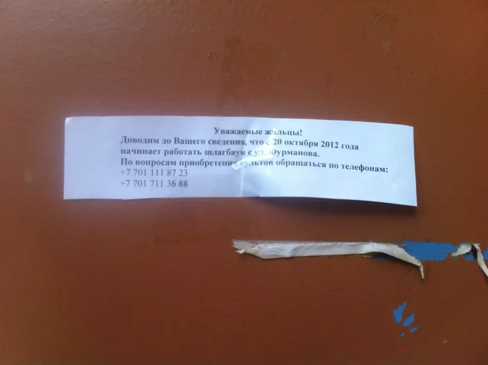 Однако, как пояснил сам инициатор идеи, во дворе дома №51 расположено множество юридических контор, и машины, подъезжающие к ним, представляют опасность для жильцов и детей. По его словам, с 8 утра во двор заезжают десятки автомашин. Поэтому, говорит он: "Мы решили за собственный счет установить электрический шлагбаум, управлять которым можно пультом на расстоянии 50 метров. Пенсионерам, желающим приобрести пульт дистанционного управления, он обойдется в 1500 тенге". Однако он не пояснил, как быть пожилым людям, которые в нужный момент не смогут открыть шлагбаум бригаде скорой медицинской помощи.