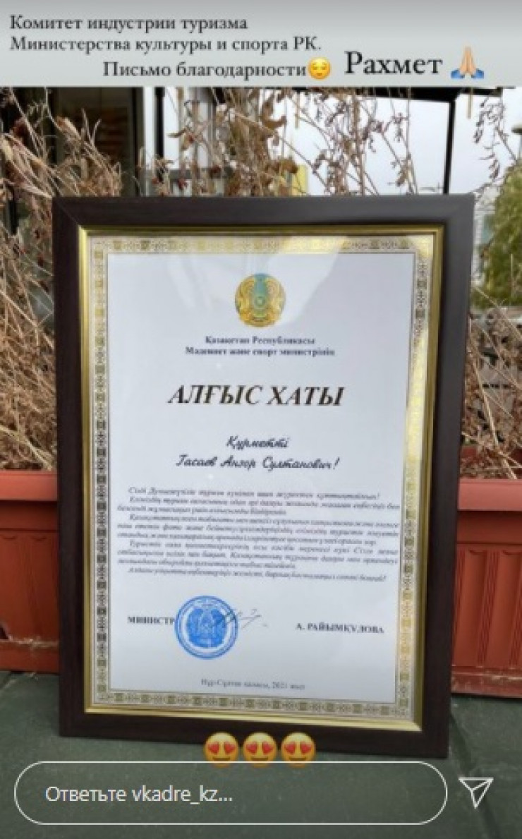 Отметим, что автор видео Анзор Гасаев накануне получил благодарственное письмо от министра культуры и спорта Актоты Раимкуловой в честь Дня туризма.