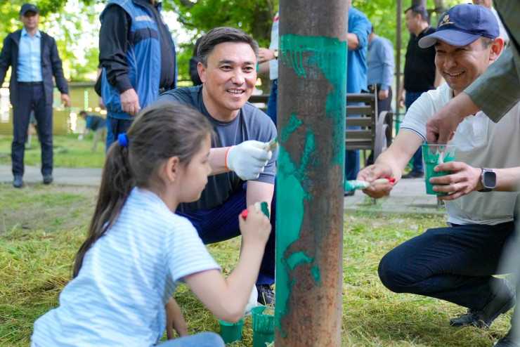 Аким Шымкента Габит Сыздыкбеков и аким Аль-Фарабийского района Рашид Мынбаев также приняли участие в уборке территории возле многоэтажных домов на пересечении проспекта Республики и улицы Калдаякова. Вместе с представителями старшего поколения, представителями общественности, студентами, активной молодежью и волонтерами они красили скамейки и бордюры, убирали мусор, работали граблями.