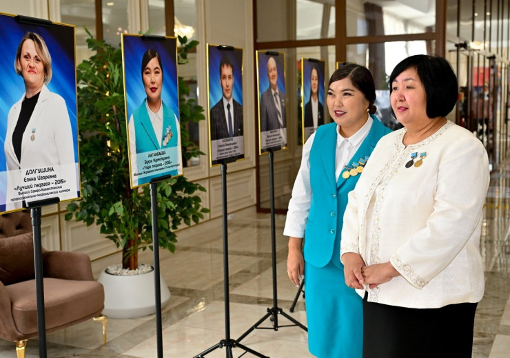 В холле была представлена галерея лучших учителей, золотого фонда региона. Среди них учителя-новаторы, победители республиканского конкурса "Лучший педагог", мастера и магистры.