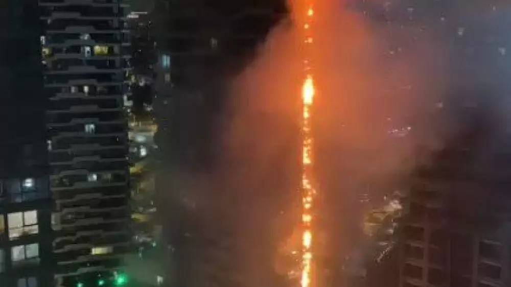 Вспыхнувший на нижних этажах небоскреба огонь через сайдинг быстро добрался до верхнего этажа здания.
