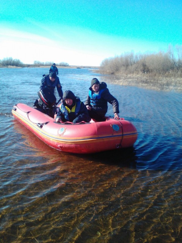 Н. Кротов - слева на переднем плане, Т. Габдышев - справа на втором плане. 15 апреля принимали участие в эвакуации людей, попавших в зону затопления в садоводческом коллективе "Эко" Актобе, находящегося в пойме реки Илек.