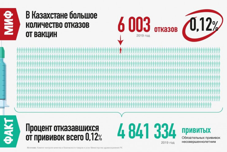 Он сообщил, что 2019 году в Казахстане привили 4,8 миллиона детей, а отказов от прививки было 6003, то есть всего лишь 0,12 процента.