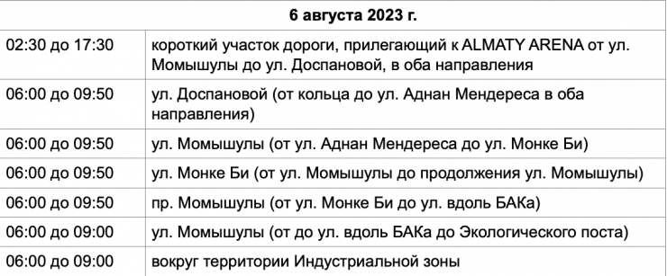 Короткий участок дороги, прилегающий к ALMATY ARENA от улицы Момышулы до улицы Доспановой, будет перекрыт с 02:30 до 17:30 6 августа в оба направления.