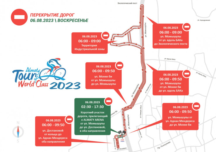 Оргкомитет Tour of World Class Almaty информирует жителей и гостей мегаполиса о том, что в день велогонки будет частично перекрыто движение на некоторых участках дорог в местах прохождения дистанции.