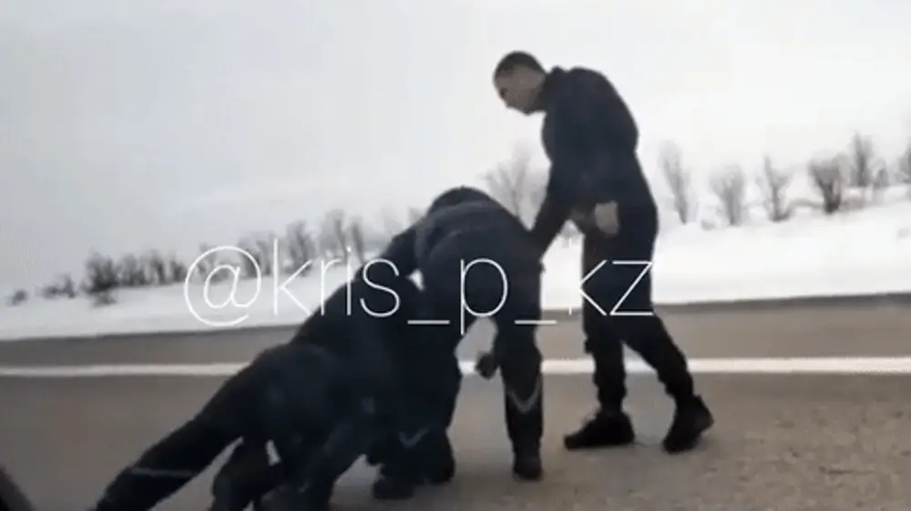 На кадрах, которые рассылают друг другу казахстанцы, видно, как полицейского валит на асфальт мужчина и завязывается драка. Судя по видео, инцидент произошел на загородной трассе. Чуть позже в потасовку вмешивается коллега патрульного и мужчина, они разнимают дерущихся.