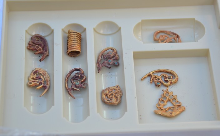 Несмотря на то что захоронение было разграблено, археологам все же удалось найти ценные предметы, свидетельствующие о высокоразвитом ювелирном мастерстве наших предков. Кроме шести золотых украшений, выполненных в традиционном для сакских племен зверином стиле, обнаружены крохотные золотые бляшки размером не больше зернышка проса. К этим мелким изделиям припаяны ушки еще меньшего размера, за которые их пришивали к одежде. Это говорит о том, что искусные мастера того времени хорошо владели секретами ювелирного дела, использовали технику микропайки, не возможную без лупы.