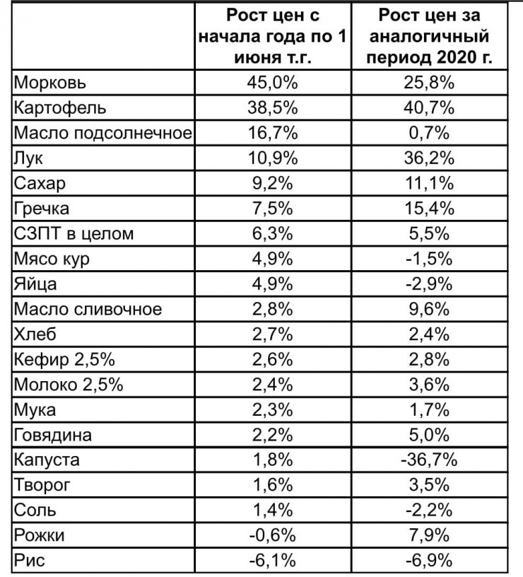По данным Министерства торговли и интеграции, с начала текущего года среди всех товаров больше всего подорожали: морковь - на 45,0 процента, картофель - на 38,5 процента, масло подсолнечное - на 16,7 процента, лук - на 10,9 процента, сахар - на 9,2 процента, крупа гречневая - на 7,5 процента.