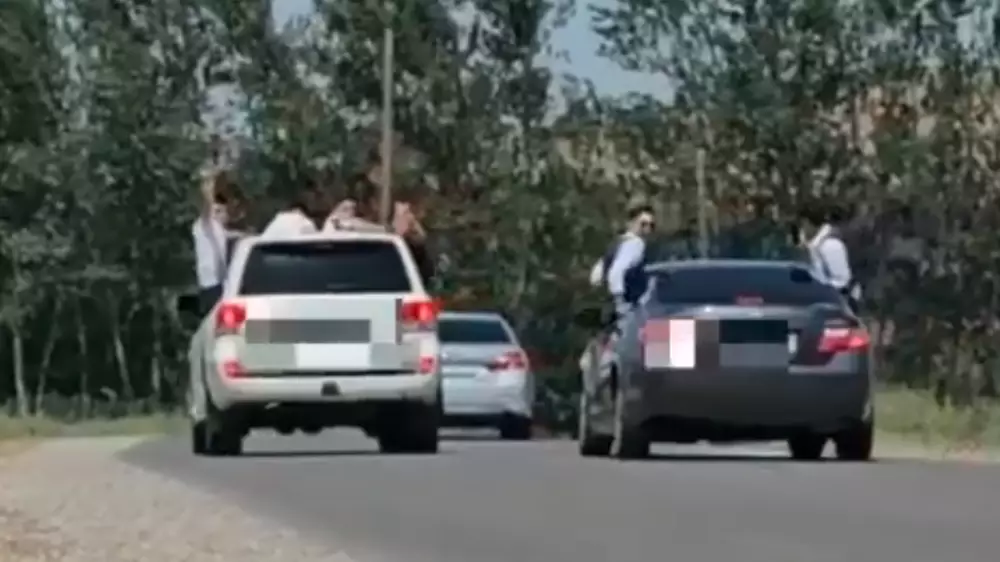 В ходе мониторинга социальных сетей стражи порядка обратили внимание на видеозапись, сделанную на одной из дорог Толебийского района. На кадрах видно, как из машин в кортеже по пояс высовываются молодые люди, размахивают руками, снимая происходящее на камеру.