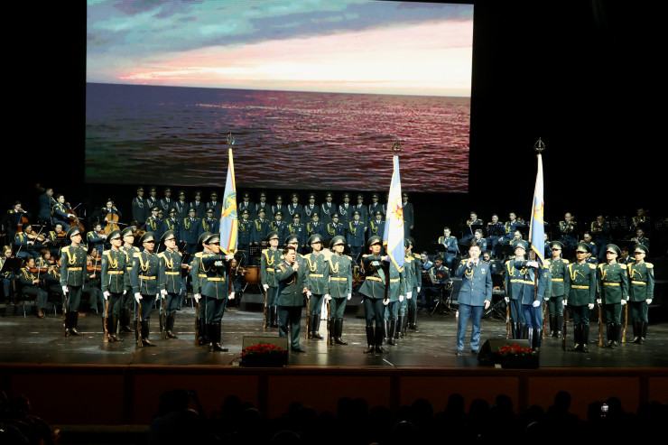 Солисты и вокальные группы, танцевальные и фольклорно-этнографические коллективы, музыканты военного и эстрадно-симфонического оркестров представили зрителям новую военно-патриотическую программу, специально подготовленную в честь Дня Республики.