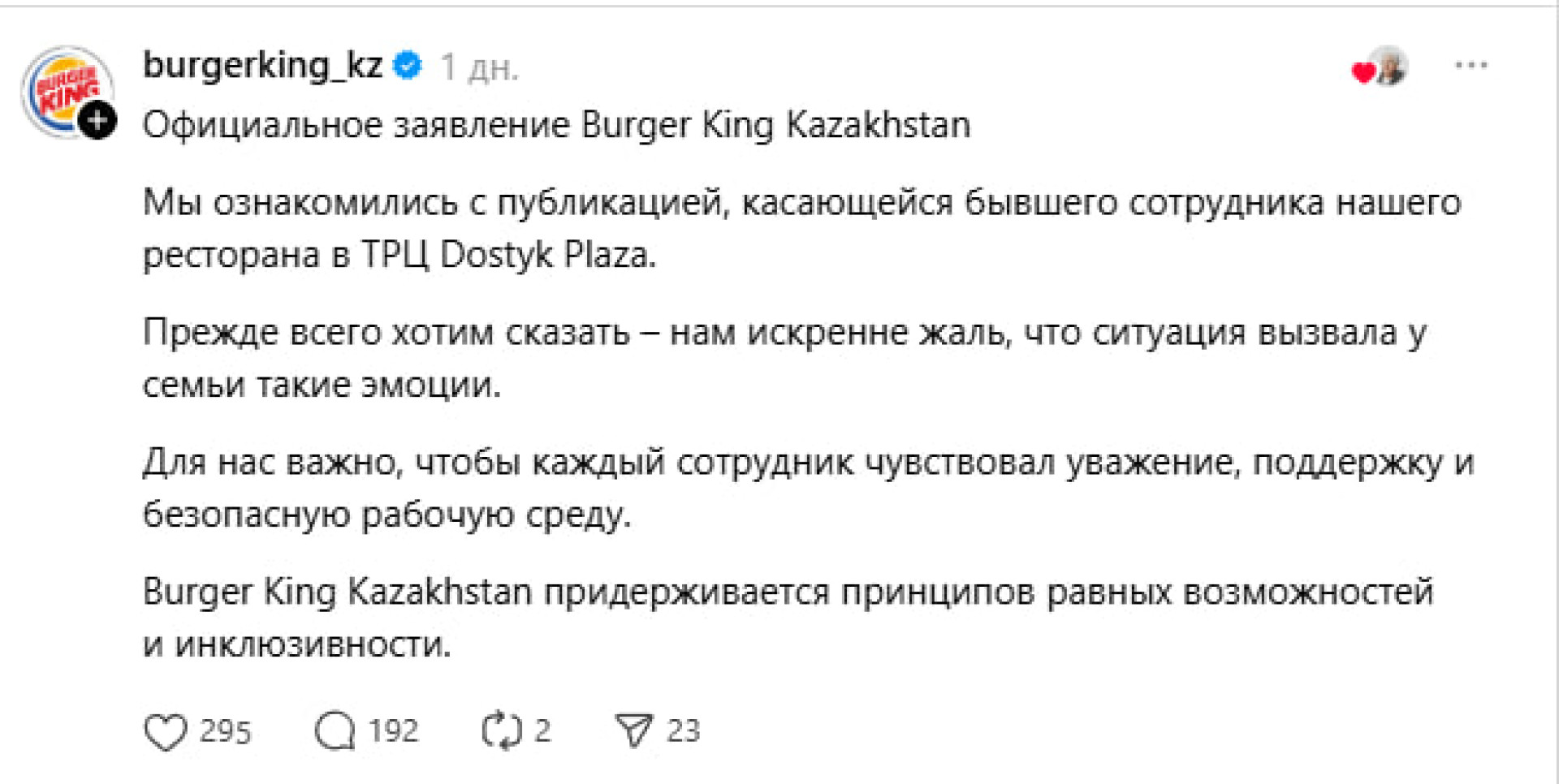 "Мы ознакомились с публикацией, касающейся бывшего сотрудника нашего ресторана в ТРЦ Dostyk Plaza. Прежде всего хотим сказать – нам искренне жаль, что ситуация вызвала у семьи такие эмоции. Для нас важно, чтобы каждый сотрудник чувствовал уважение, поддержку и безопасную рабочую среду. Burger King Kazakhstan придерживается принципов равных возможностей и инклюзивности".