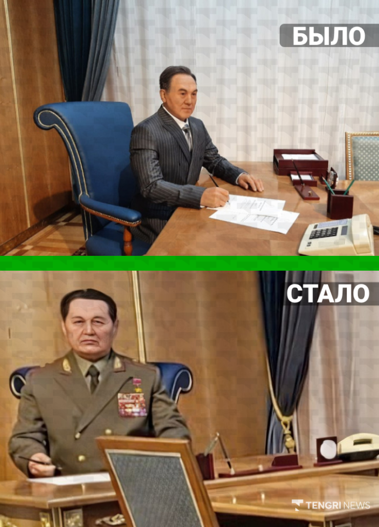Ранее восковая фигура первого президента располагалась за письменным столом в одном из залов музея. Теперь вместо Назарбаева за этим же письменным столом возвышается восковая фигура генерала армии Сагадата Нурмагамбетова - советского и казахстанского военачальника, первого министра обороны Казахстана, Героя Советского Союза и Народного Героя Казахстана.
