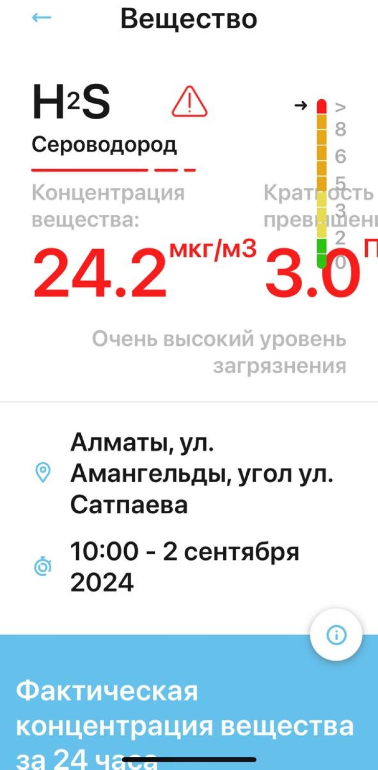 Согласно данным приложения, концентрация сероводорода (H2S) в воздухе за сутки составляет 24,2 мкг/м3 при норме 3 мкг/м3.