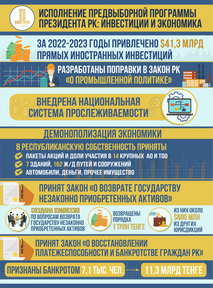 В правительстве рассказали, как реализуется предвыборная программа Президента Касым-Жомарта Токаева "Справедливый Казахстан - для всех и для каждого. Сейчас и навсегда" в отношении развития экономики и привлечения инвестиций, передает Tengrinews.kz со ссылкой на Primeminister.kz.