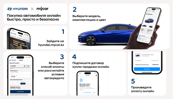 "Услуга выбора и покупки автомобиля онлайн набирает популярность в мире. Клиентам нравится, что в комфортной обстановке в удобное время можно изучить модельный ряд и технические характеристики, узнать о действующих акциях и предложениях по кредитованию и страхованию, заказать тест-драйв. Hyundai в Казахстане выбрал Mycar.kz в качестве онлайн-дилера, поскольку эта компания обладает необходимой инфраструктурой и IT-решениями. Сейчас услуга доступна в Алматы, со временем подключим и другие города. Надеемся, что наши клиенты оценят скорость, прозрачность и удобство такого подхода", – рассказал директор дистрибуции Hyundai в Казахстане в составе "Астана Моторс" Марат Смагулов.