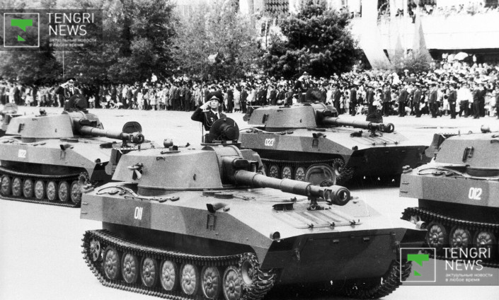 Военный парад в честь 50-летия Великой Победы. Алматы, 1995 год. Фото: Центральный государственный архив кинофотодокументов и звукозаписей РК.