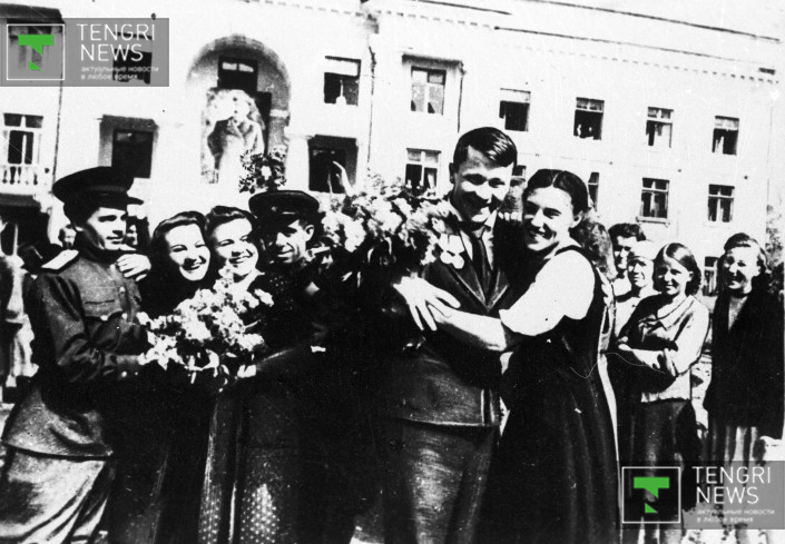 Народные ликования в День Победы над фашистской Германией. Алма-Ата, 9 мая 1945 года. Фото: Центральный государственный архив кинофотодокументов и звукозаписей РК.
