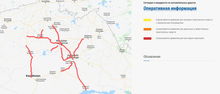 Карта с оперативной информацией о дорогах на сайте "КазАвтоЖола" на данный момент выглядит так: