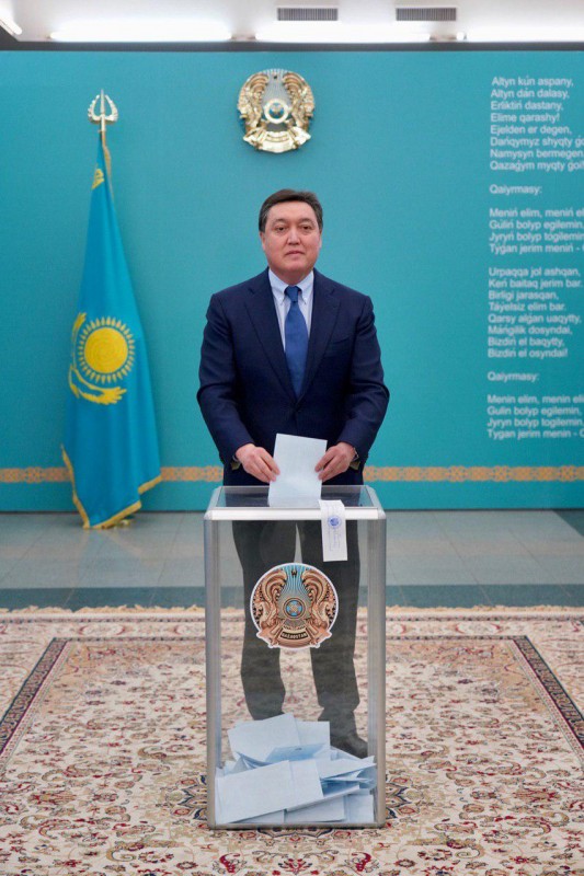 Как сообщили в правительстве, премьер-министр Аскар Мамин проголосовал на избирательном участке № 138 в 7.30 утра, который находится в здании концертного зала "Астана".