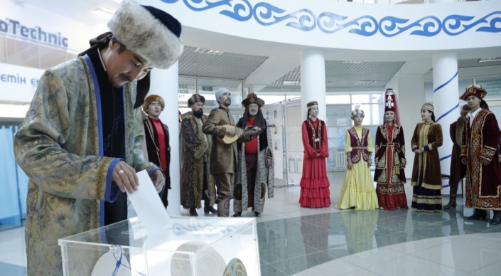 Актеры драмтеатра имени Махамбета Утемисова в Атырау пришли на выборы в сценических костюмах. Они исполнили несколько песен из постановки "Кыз Жибек".