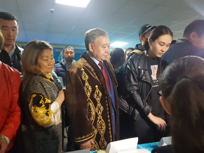 Кандидат в президенты от партии "Ауыл" Толеутай Рахимбеков пришел на голосование с супругой, дочкой и внуками. И, как он сам отметил, в очень хорошем настроении - день голосования совпал с днем рождения старшего внука Уалихана.