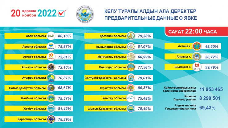 Объявлены предварительные итоги явки избирателей на выборы президента в Казахстане. По данным ЦИК, на 22.00 по времени Астаны явка составила 69,43 процента, передает корреспондент Tengrinews.kz.