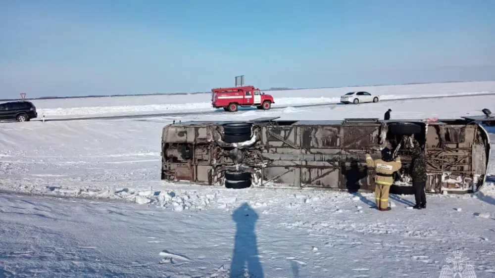 По информации ведомства, водитель автобуса не справился с управлением, допустил съезд транспортного средства с трассы и опрокидывание автобуса на бок.