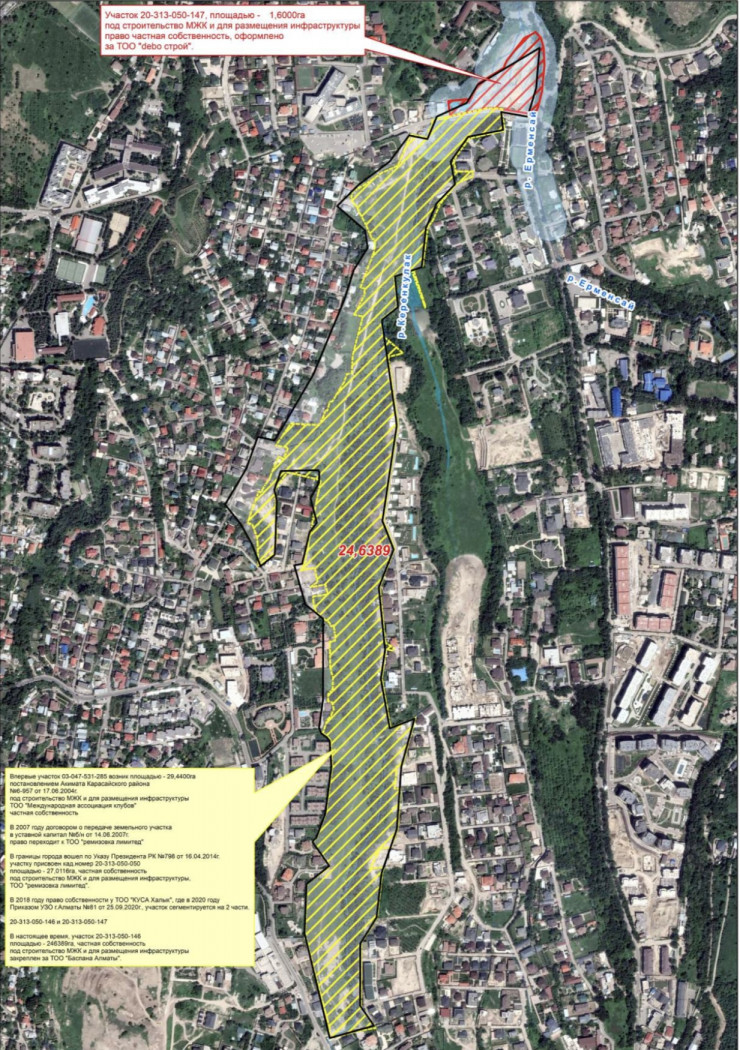 "На сегодня участок принадлежит компании "Баспана Алматы" на праве частной собственности. Договор купли-продажи от 15 июля 2021 года был составлен на сумму семь миллиардов 111 миллионов тенге. Его площадь составляет 24,6 гектара. Целевое назначение - "для строительства многоэтажного жилого комплекса и для размещения инфраструктуры".