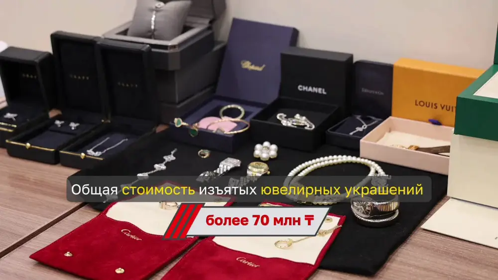 Также у Перизат Кайрат были изъяты брендовые украшения, общая стоимость которых, по предварительным подсчетам, превышает 70 миллионов тенге.