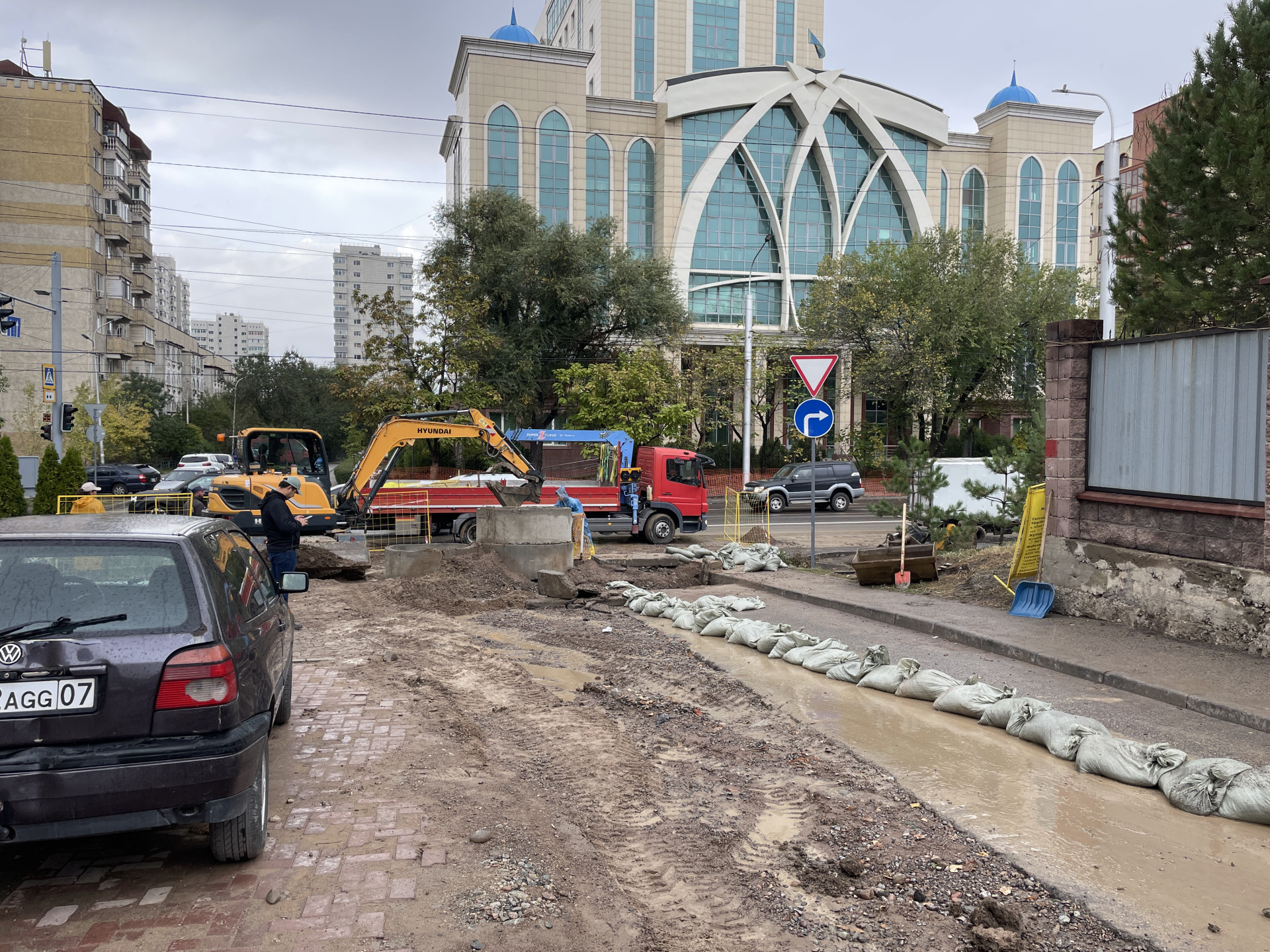 Корреспондент Tengrinews.kz выехал на место и убедился, что на данном участке улицы действительно работает несколько единиц техники, а рабочие убирают последствия ливня.